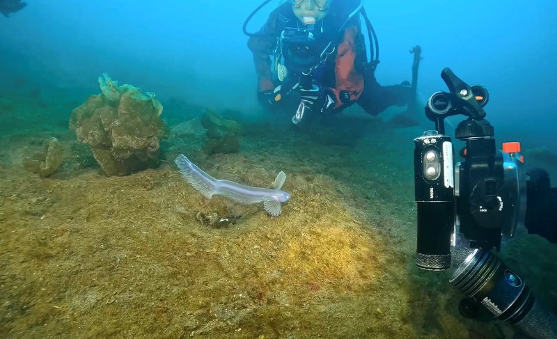 “On January 31, 2026, I miraculously spotted a deep-sea fish, jellynose fish (Ateleopus tanabensis), for the first time in 30 years at a depth of 23 meters off Cape Osezaki in the Izu Peninsula. It was about 30 cm in size, and drifted in a strange atmosphere, slowly wriggling its body just above the sand. This fish usually lives at depths of 100 to 600 meters, and its body is made of gelatin, so it is completely transparent, and you can clearly see its internal organs and what appears to be its brain. Its eyes are white, and its pectoral and dorsal fins are uniquely shaped and never close but are always spread out as it swims.